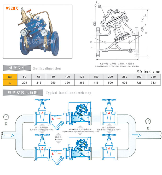Y42X隔膜式可调减压阀是安装于高层建筑给排水管道上,将进口压力减至某一需要的出口压力的特种阀门。该阀门依靠本身能量使出口压力保持稳定在设定值,即出口压力不因进口压力及流量的变化而变化,并且阀门控制系统的进口处装有一个过滤器,利用流体特性,使比重较大、直径较大的悬浮颗粒不会进入控制系统,确保系统循环畅通无阻,使阀门能安全可靠的运行。减压范围:出口压力 0.05~1.2MPam