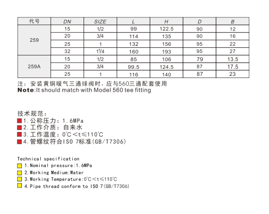 259/259A (Q15F-16T) 黄铜暖气三通球阀